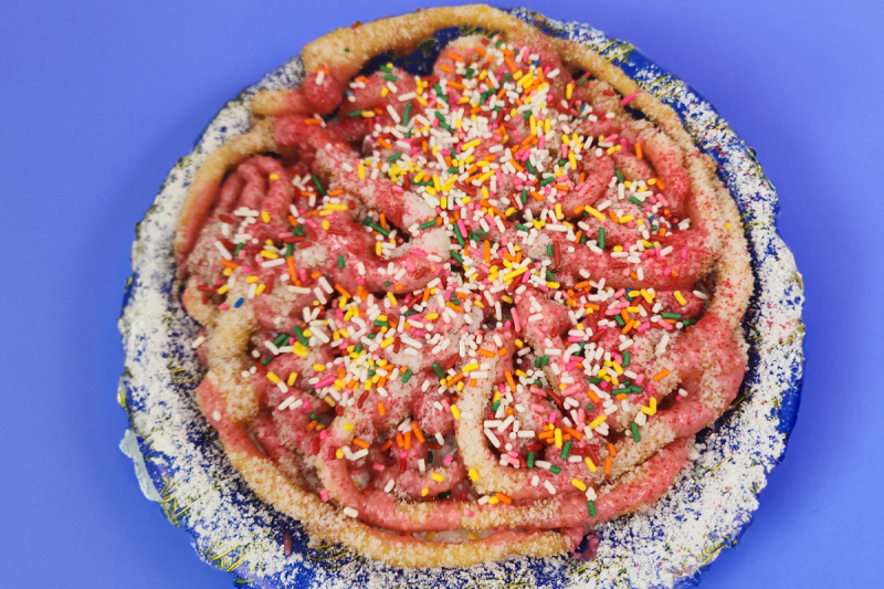 Funnel cake with powdered sugar, Barbie pink icing and two kinds of sprinkles.
