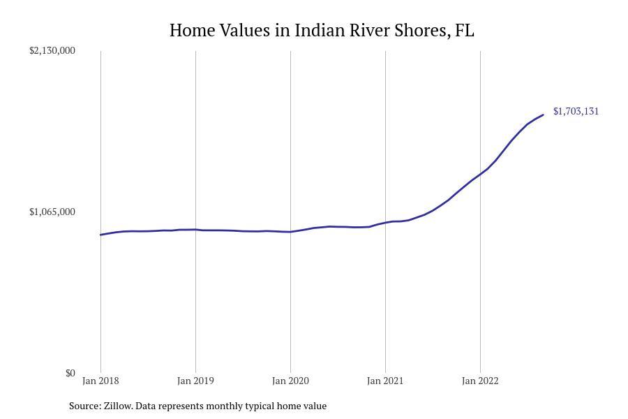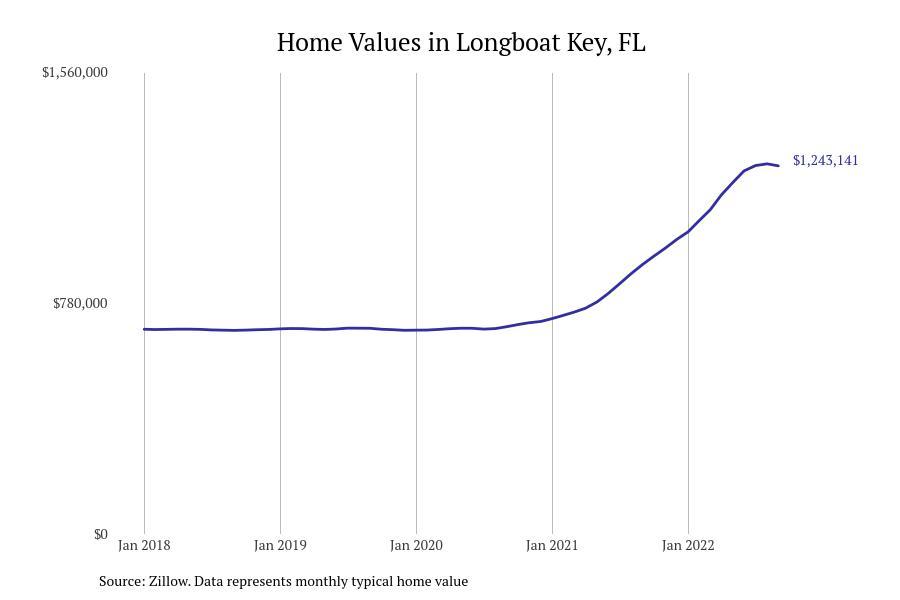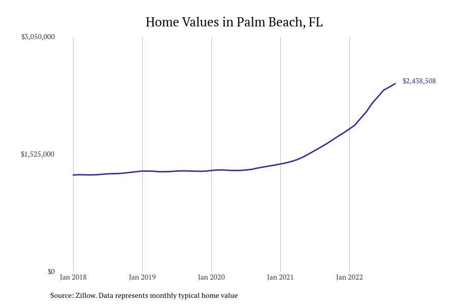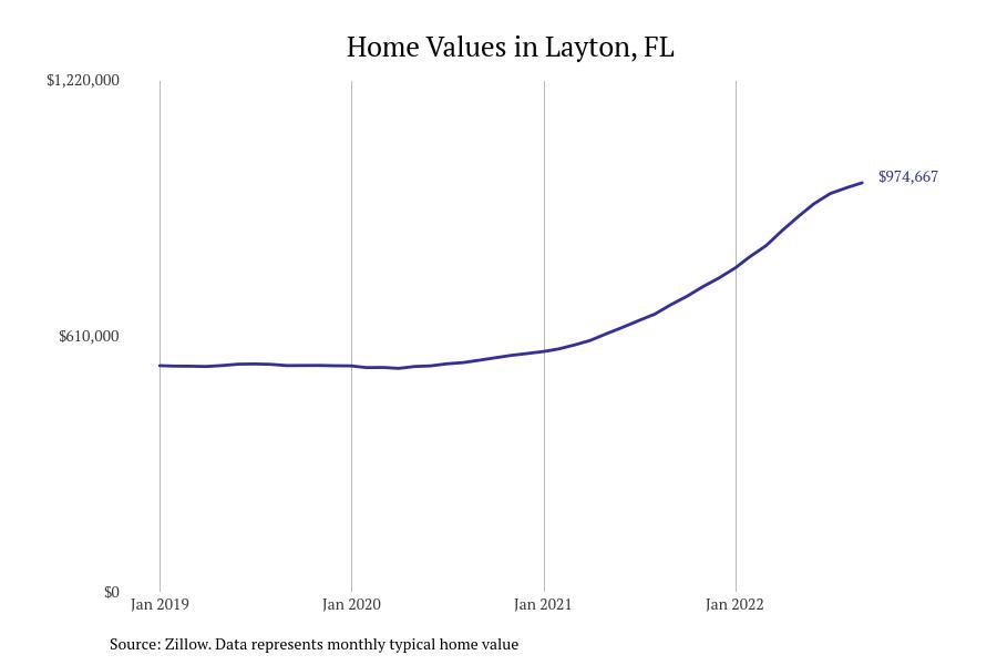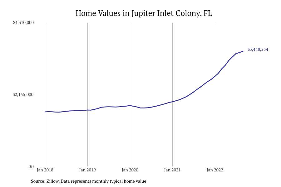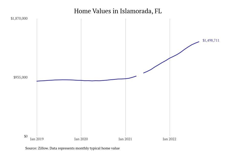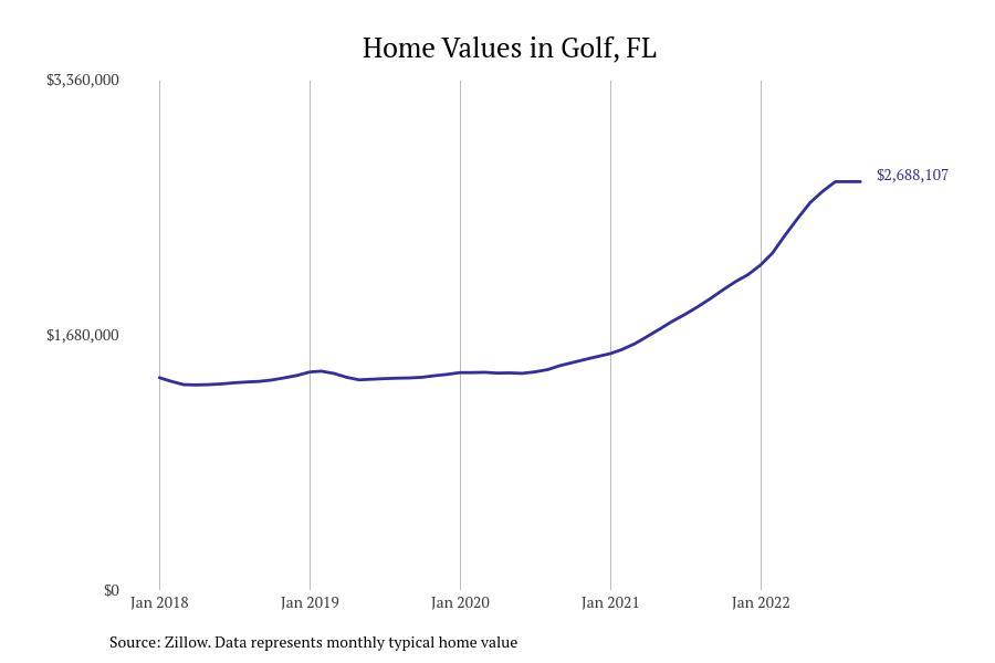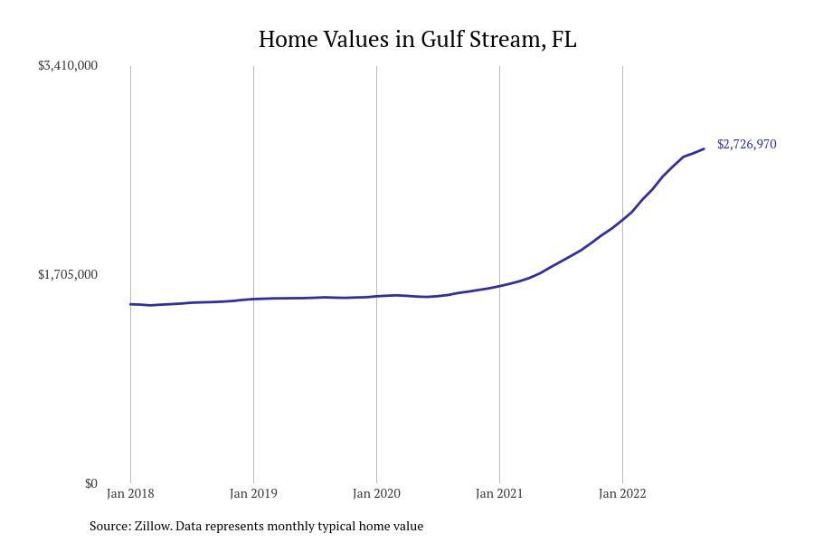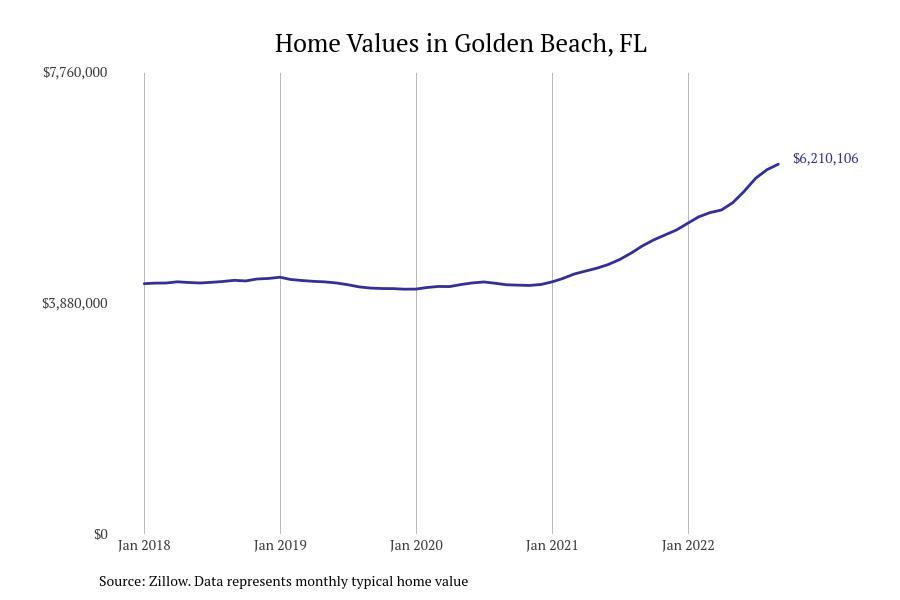 Stacker compiled a list of cities with the fastest growing home prices in Florida using data from Zillow. Cities are ranked by the dollar change in Zillow Home Values Index for all homes from the 12 months ending September 2022. The charts in this story were created automatically using Matplotlib. Data was available for 628 cities and towns in Florida. Home values in the top city on the list grew by $2,285,795 over the last 12 months.