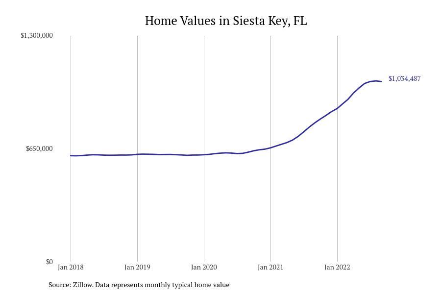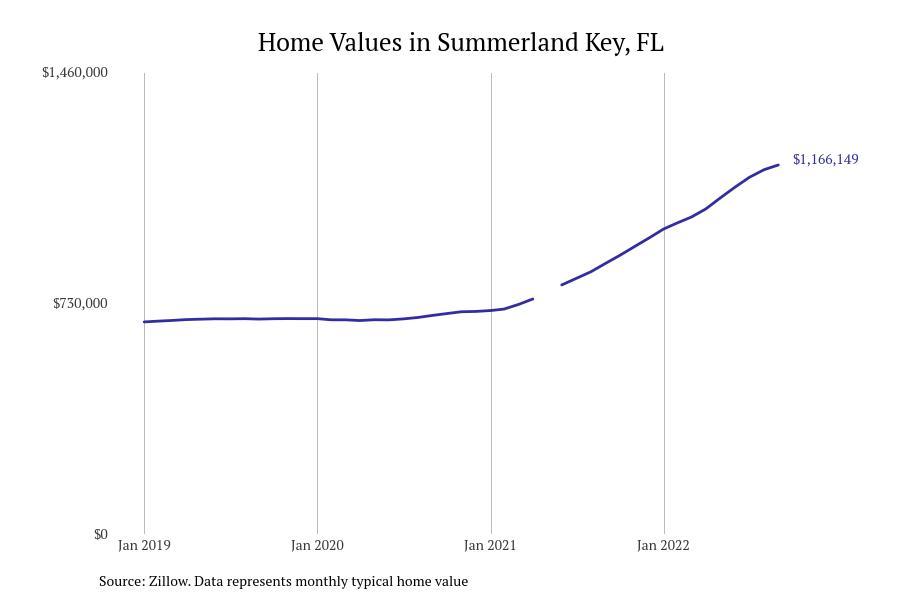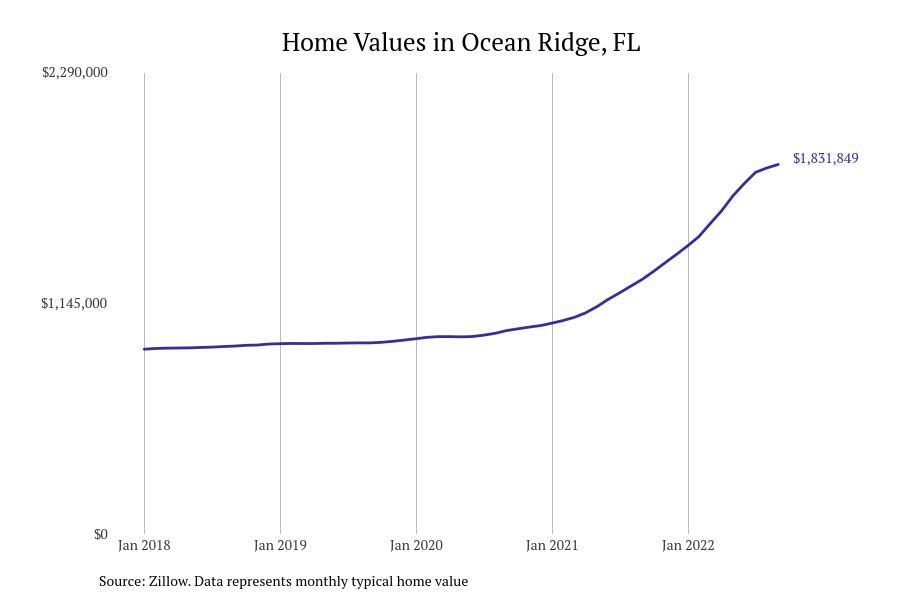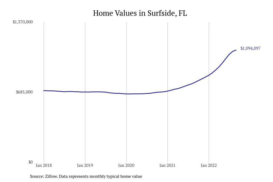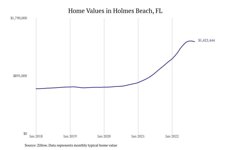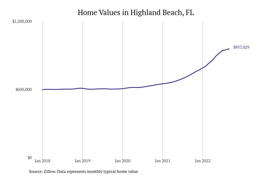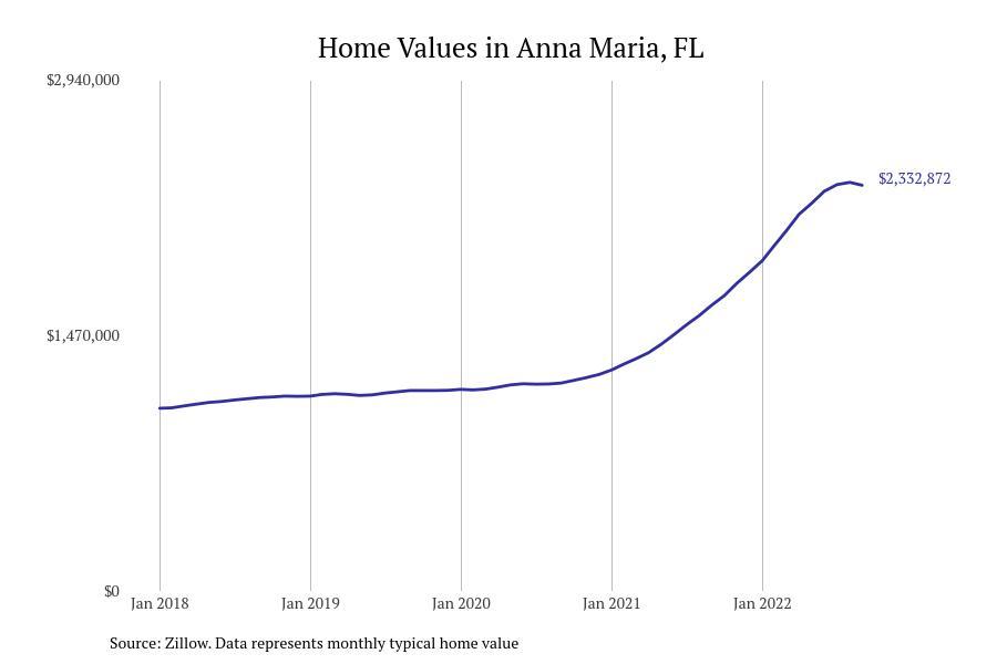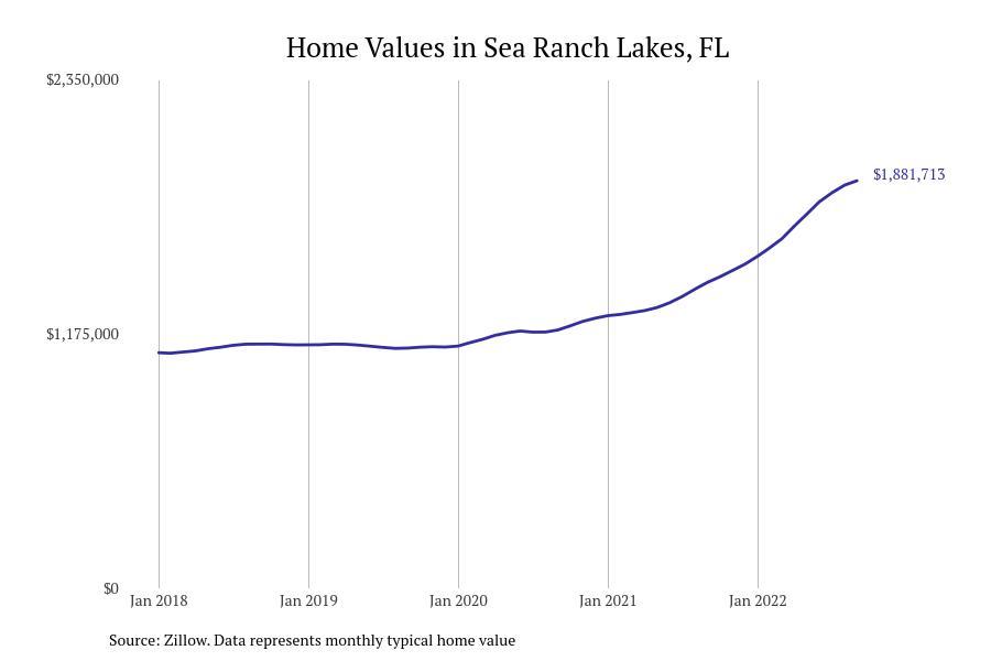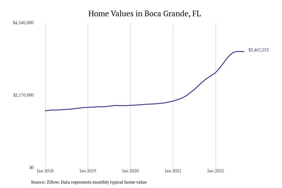 Stacker compiled a list of cities with the fastest growing home prices in Florida using data from Zillow. Cities are ranked by the dollar change in Zillow Home Values Index for all homes from the 12 months ending September 2022. The charts in this story were created automatically using Matplotlib. Data was available for 628 cities and towns in Florida. Home values in the top city on the list grew by $2,285,795 over the last 12 months.