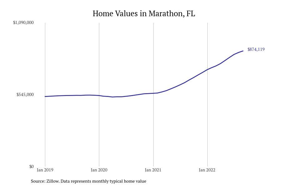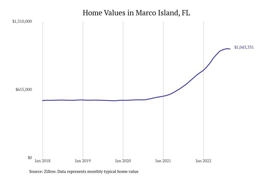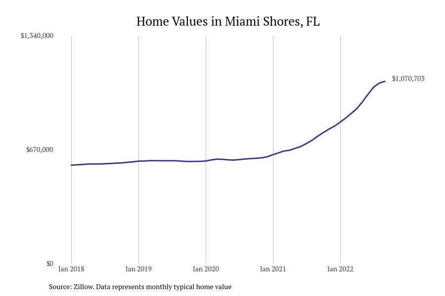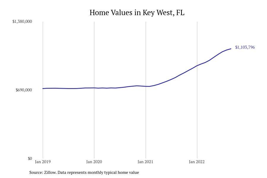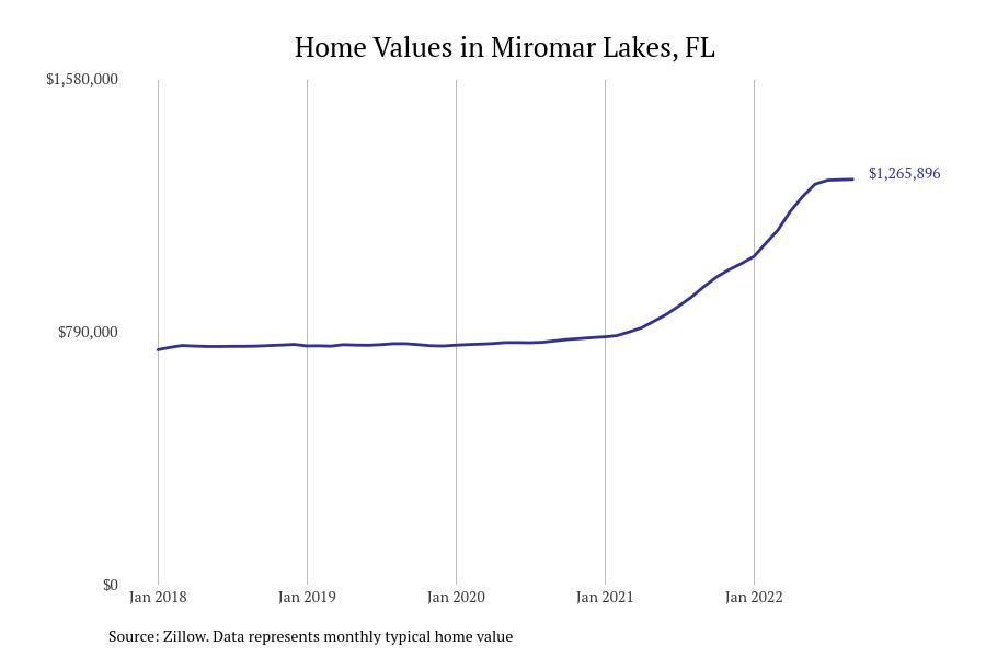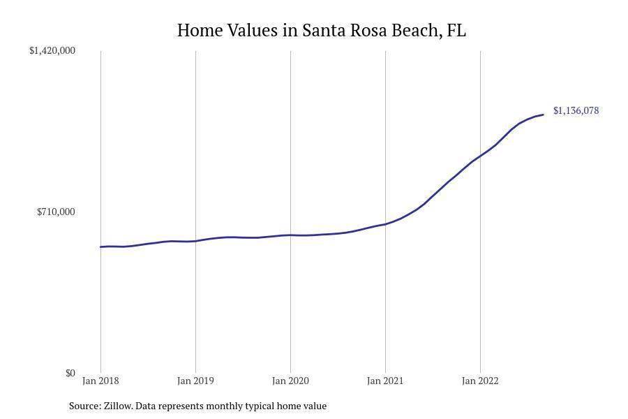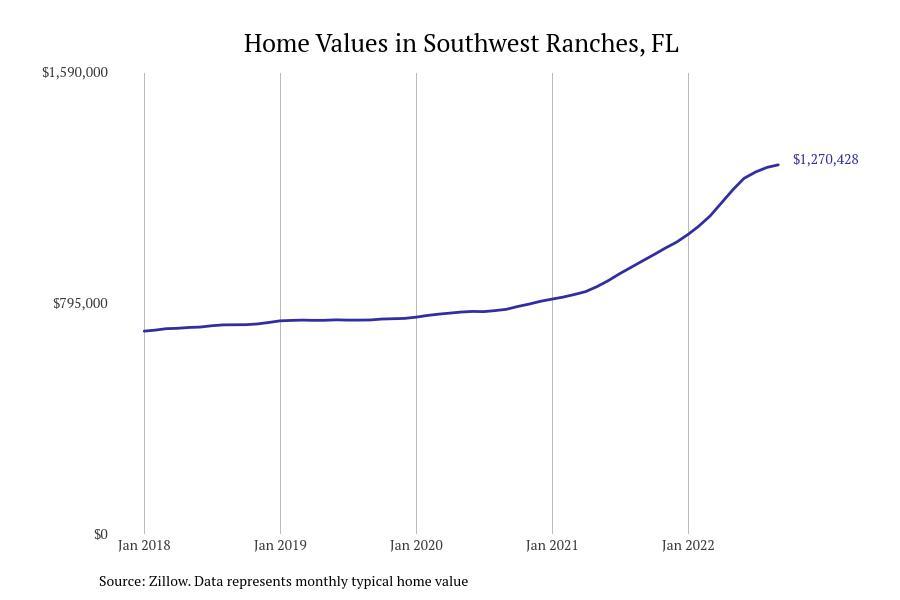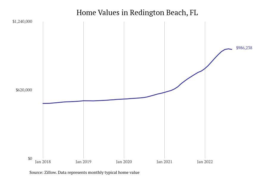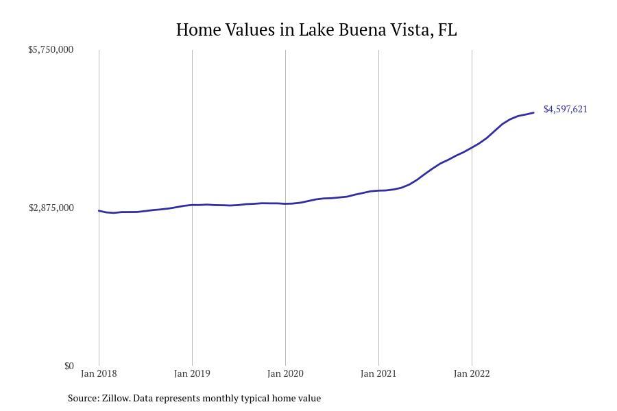 Stacker compiled a list of cities with the fastest growing home prices in Florida using data from Zillow. Cities are ranked by the dollar change in Zillow Home Values Index for all homes from the 12 months ending September 2022. The charts in this story were created automatically using Matplotlib. Data was available for 628 cities and towns in Florida. Home values in the top city on the list grew by $2,285,795 over the last 12 months.