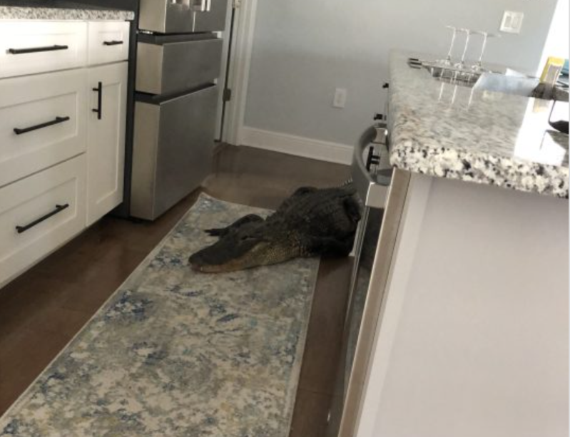 Mary Hollenback heard her front door rattle, got up to investigate, and found an 8-foot alligator in the middle of her kitchen.