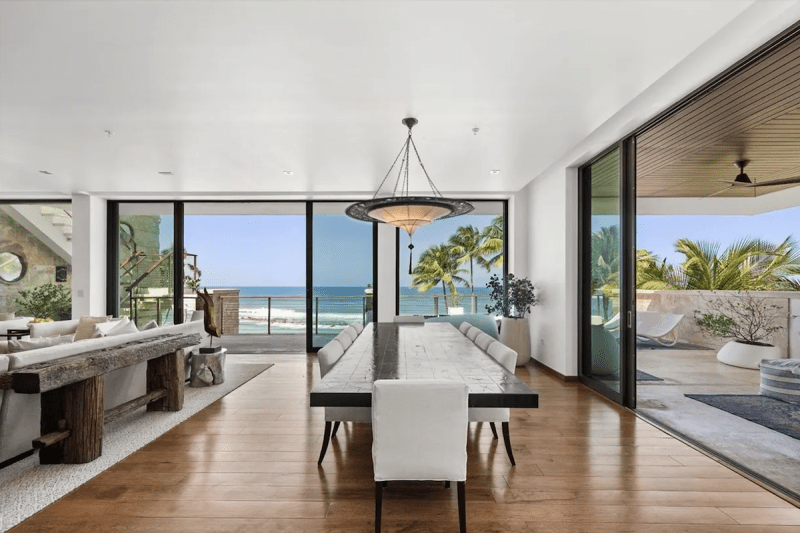 The 6,817-square-foot property has two floors, four bedrooms, an infinity pool, a 2,609-square-foot rooftop terrace, multiple lounge areas, and direct access to the beach.