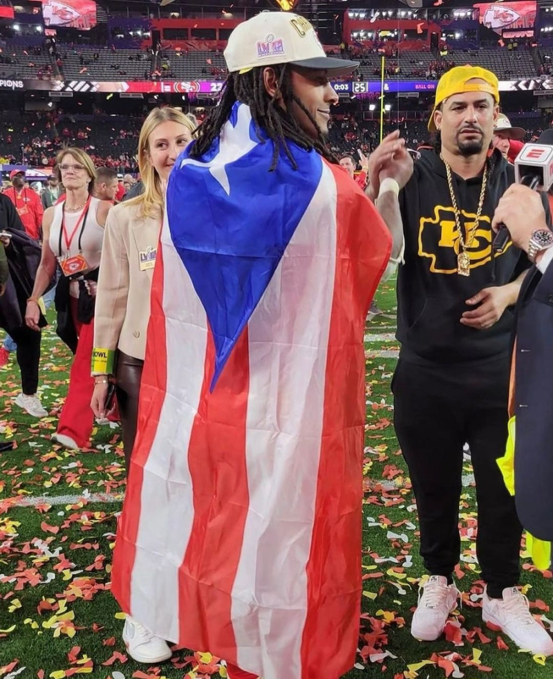 Chiefs running back Isiah Pacheco celebrated the victory on the field by wearing the Puerto Rican flag on his shoulders. His Puerto Rican roots come through his father, Julio Pacheco, who was born in Ponce.