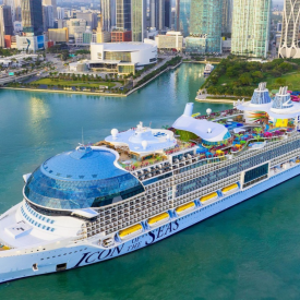 The ship includes six waterslides, seven swimming pools, an ice skating rink, a theater and more than 40 restaurants, bars and lounges.