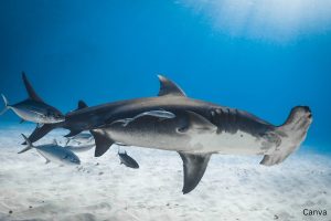 Great hammerhead shark. Reaching up to 18 feet in length, this shark, easily identified by its hammer-shaped head, is considered dangerous.