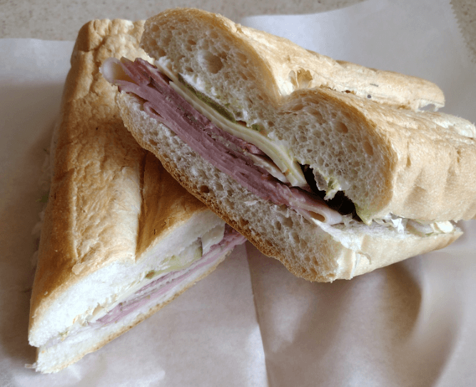 You must start by slipping narrow palmetto fronds into your Cuban white bread dough to ensure even baking and a perfect seam. Then, bake the long, narrow loaf until it reaches its signature crispy flakiness on the outside and soft airiness on the inside. Next comes ham, sliced very thin and sweetened very lightly; followed by roast pork marinated in mojo sauce, and Genoa salami. This trio of meats is topped off with Swiss cheese, three dill pickle slices, and yellow mustard. Finally, the most important step — press the sandwich until the bread is warmed, and all the ingredients fuse and melt together.