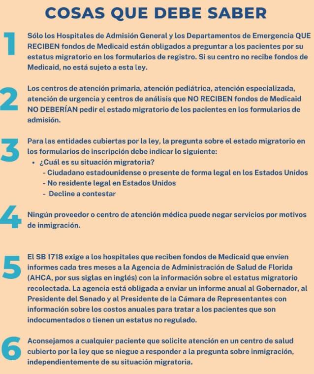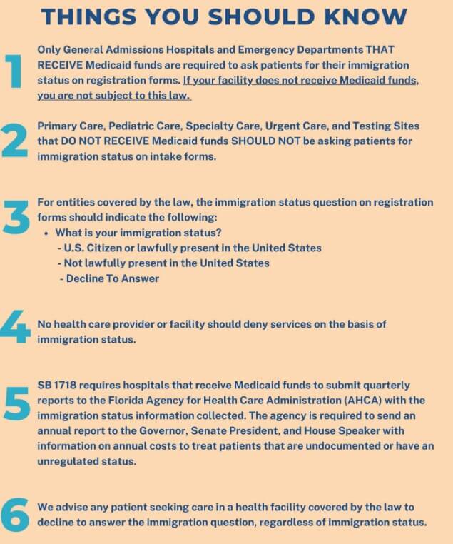 On Saturday, July 1, most Florida hospitals began collecting data on patients’ immigration status. However, the law does not require individuals to complete the immigration section of their patient form in order to receive care.